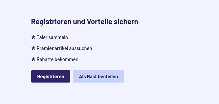 Durch eine Registrierung erhalten Sie ein eigenes Profil, in dem Sie Ihre Bestellungen einsehen, gewünschte Produkte speichern und Ihre gesammelten Taler verwalten können. Wählen Sie die für Sie passende Option und klicken Sie auf „WEITER“. Wenn Sie bereits ein Konto haben, klicken Sie auf „LOGIN“.